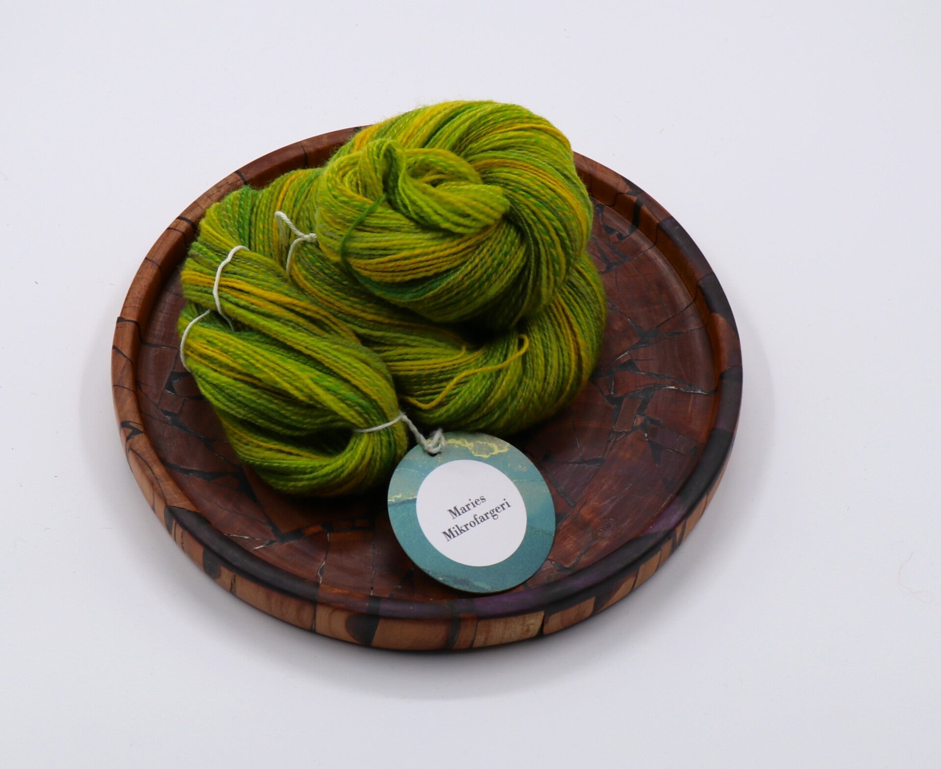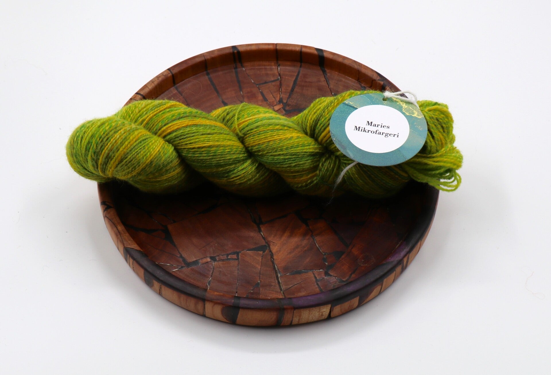 50 g gulgrønt 2-trådsgarn i polwart-ull. Powart blir ofte kalt amerikansk merino, så garnet er mykt og fint.
