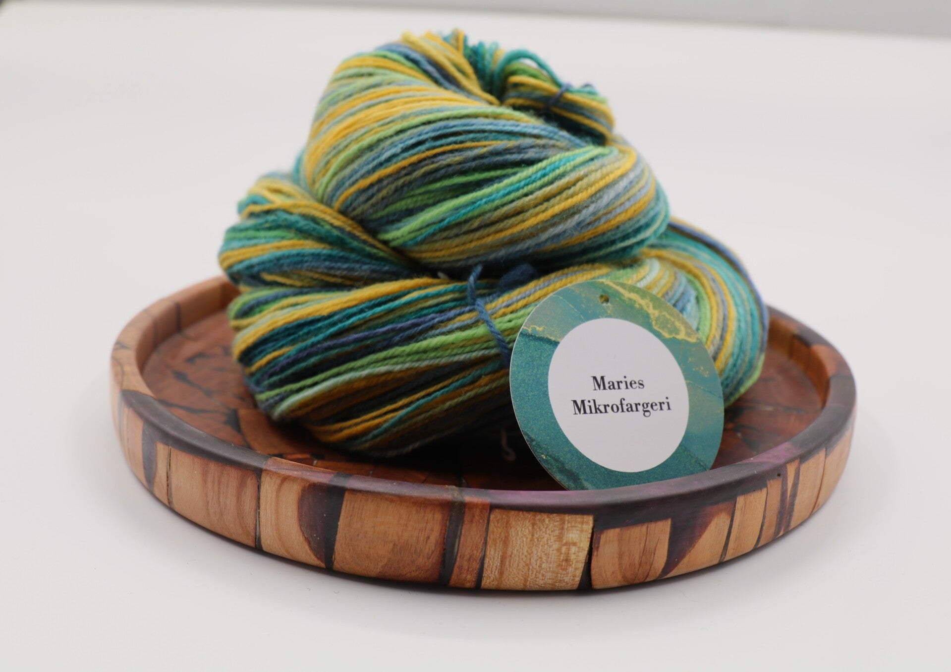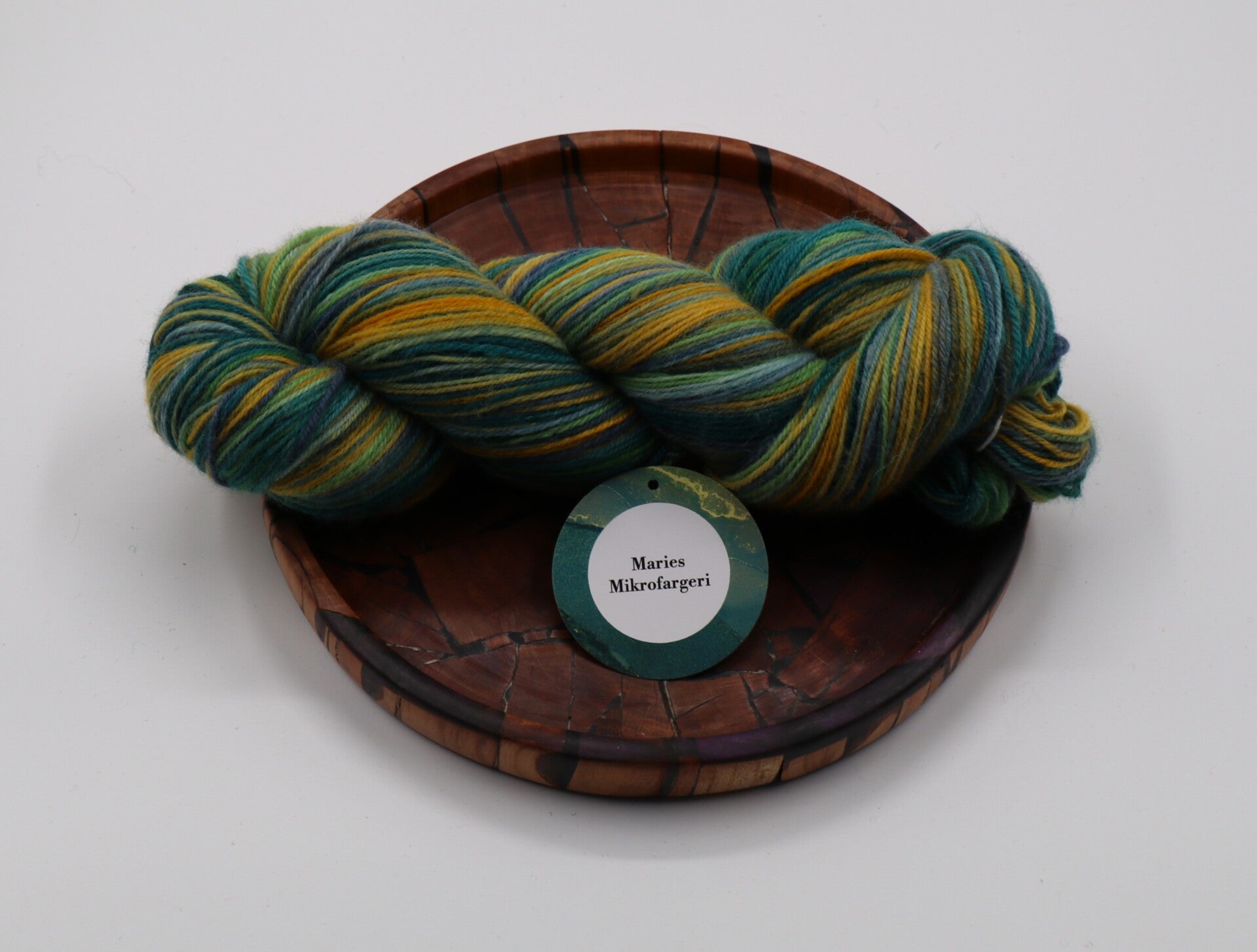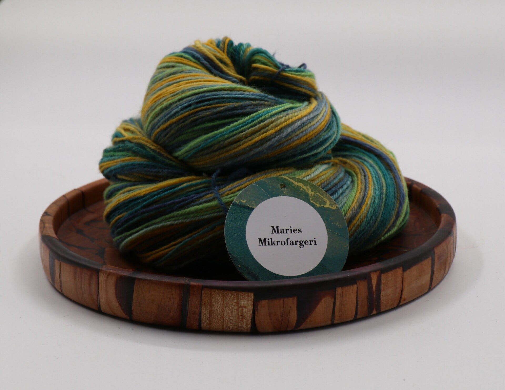 Tretrådgarn i polwarth-ull. Garnet minner meg om en tidlig vår i grønne og blå nyanser, med gule innslag.