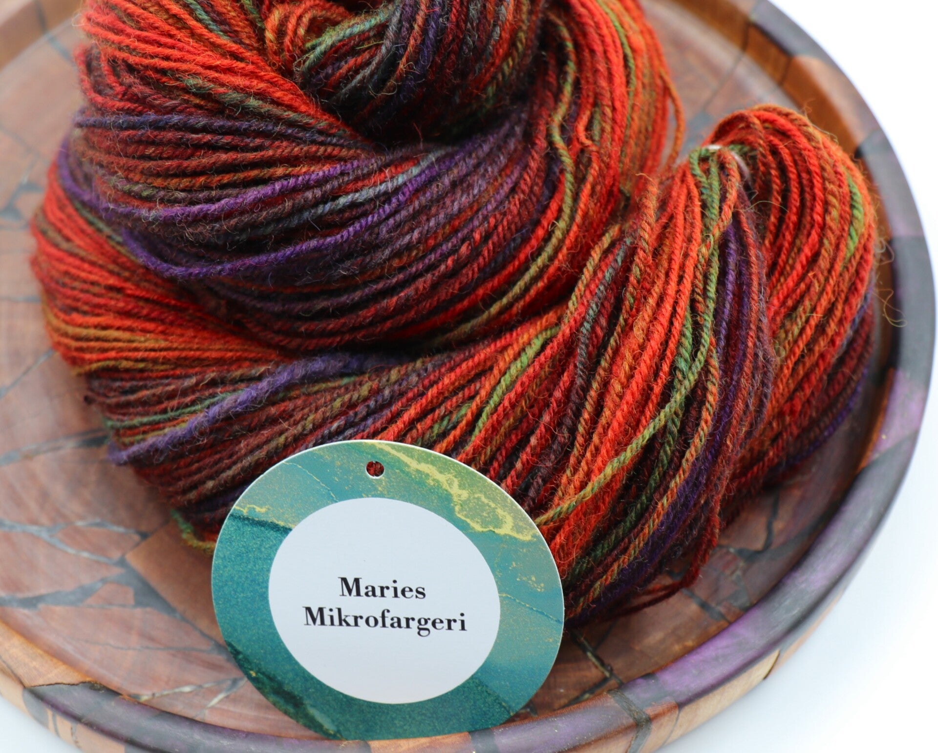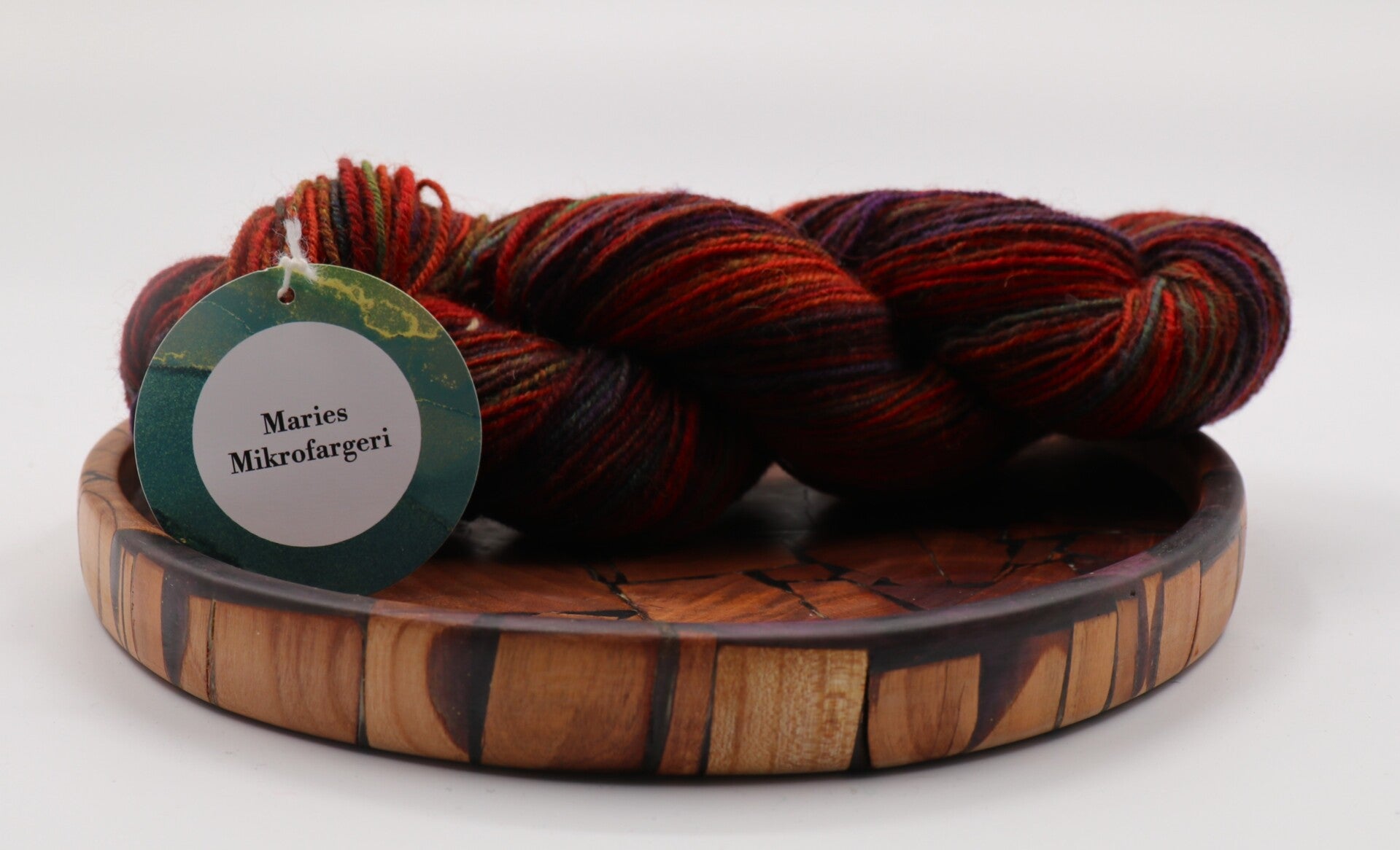 Nydelig garn i røde, orange, lilla og grønne nyanser.