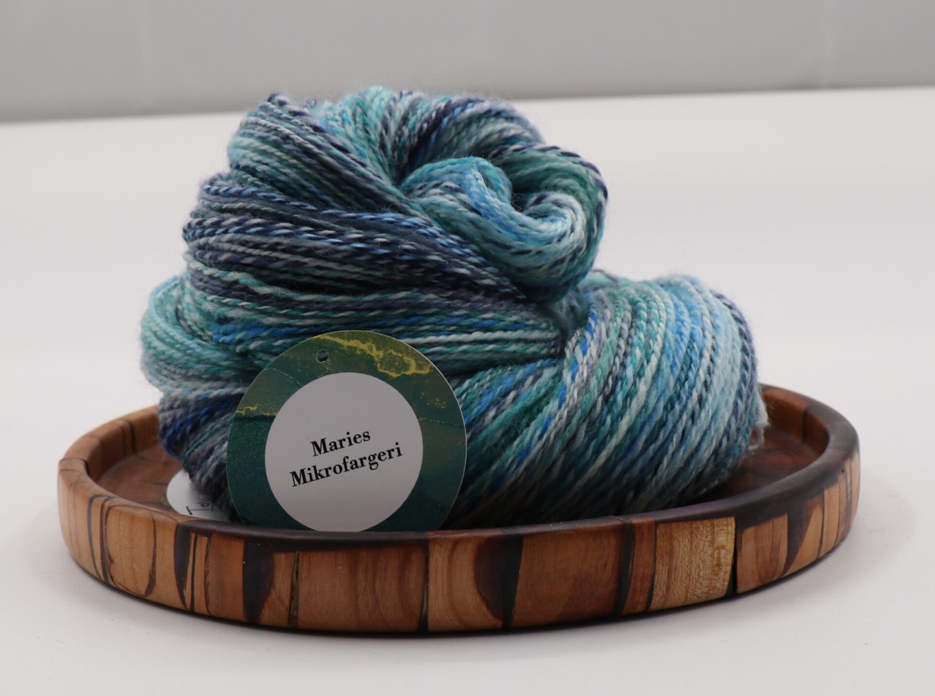 Nydelig håndspunnet totrådsgarn Norsk Kvit Sau. Vakre blå, blågrønne, himmelblå, hvite og mørk blå sjatteringer.