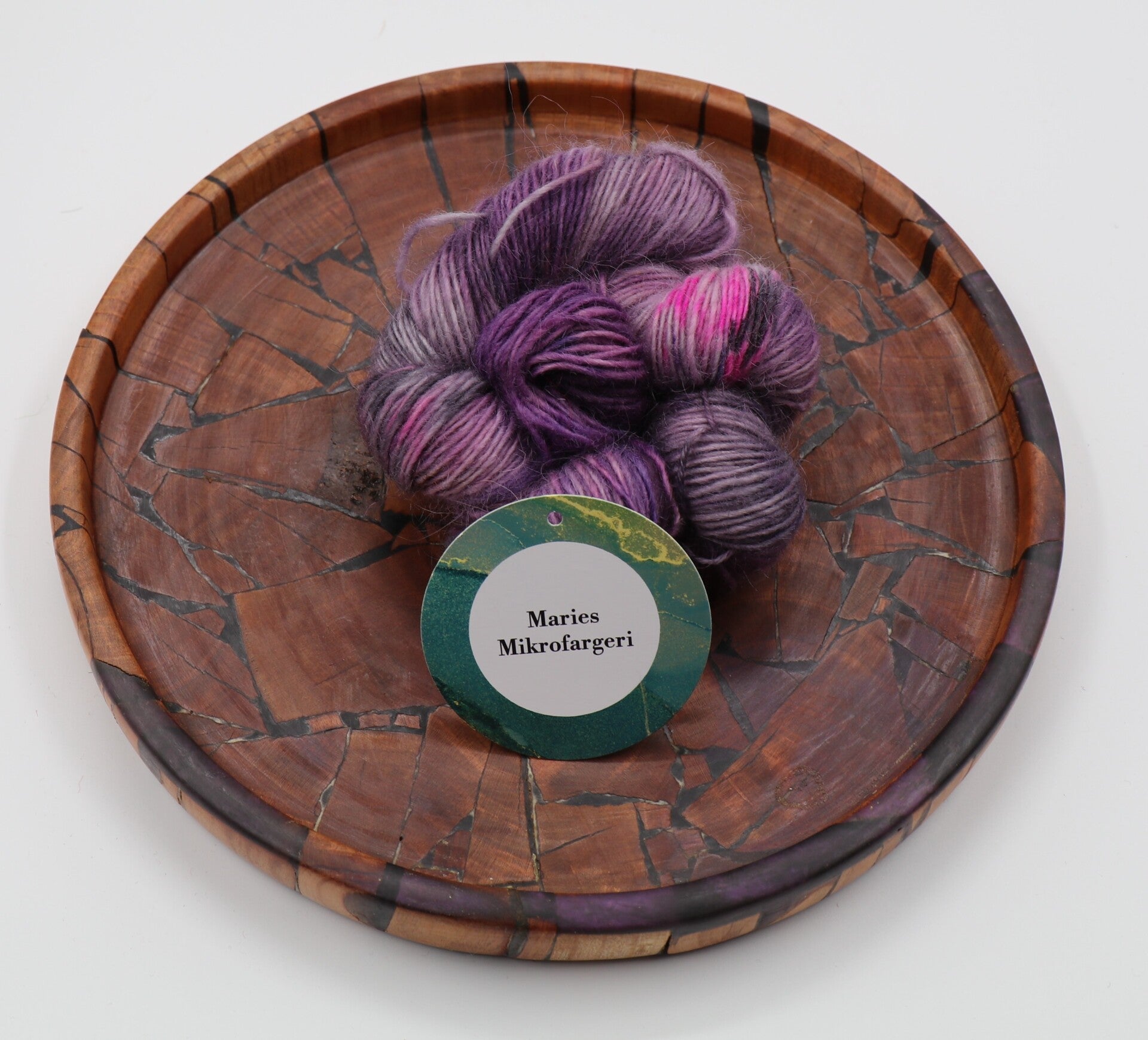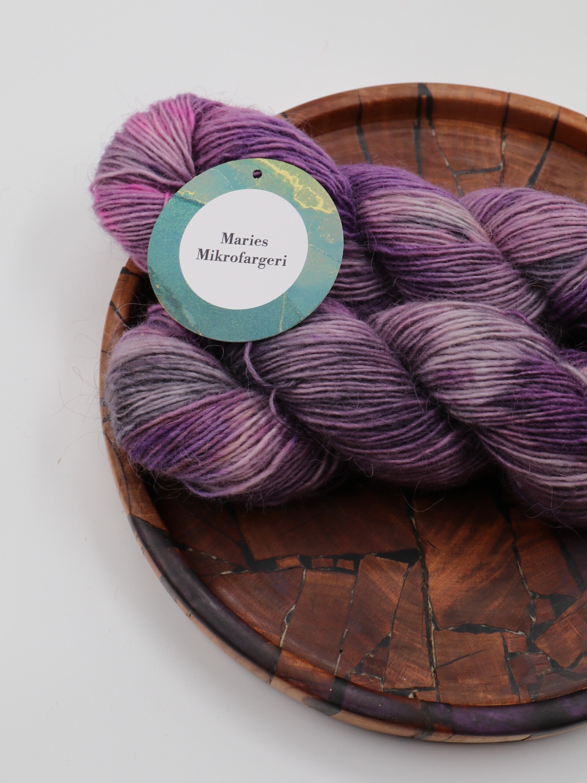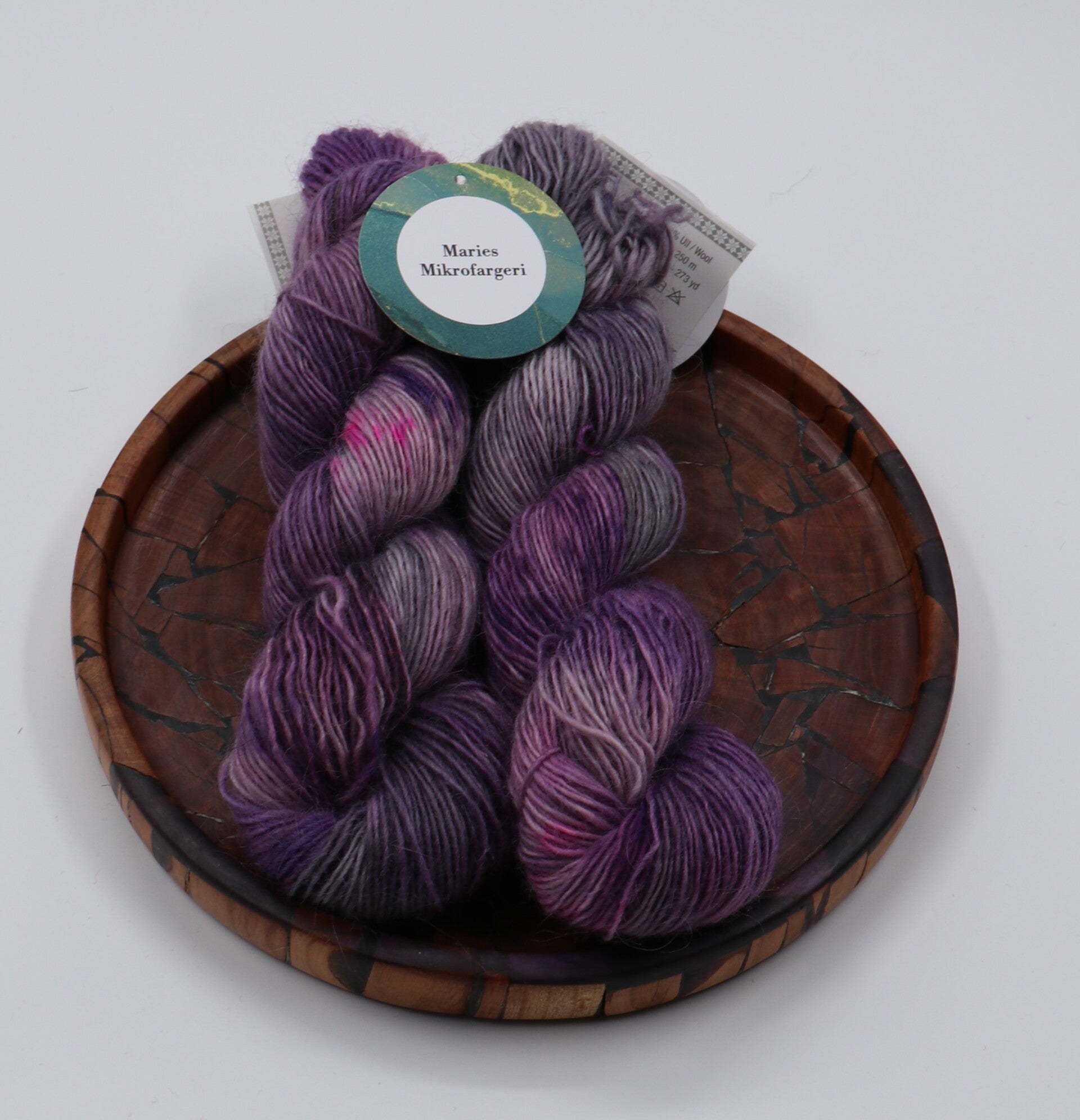 Stilig Einband ettrådsgarn i lilla og grå toner. Dette garnet er inspirert av soppen man kan finne i høstskogen. Herlig blekksopp som setter flott farge på hvit saus!