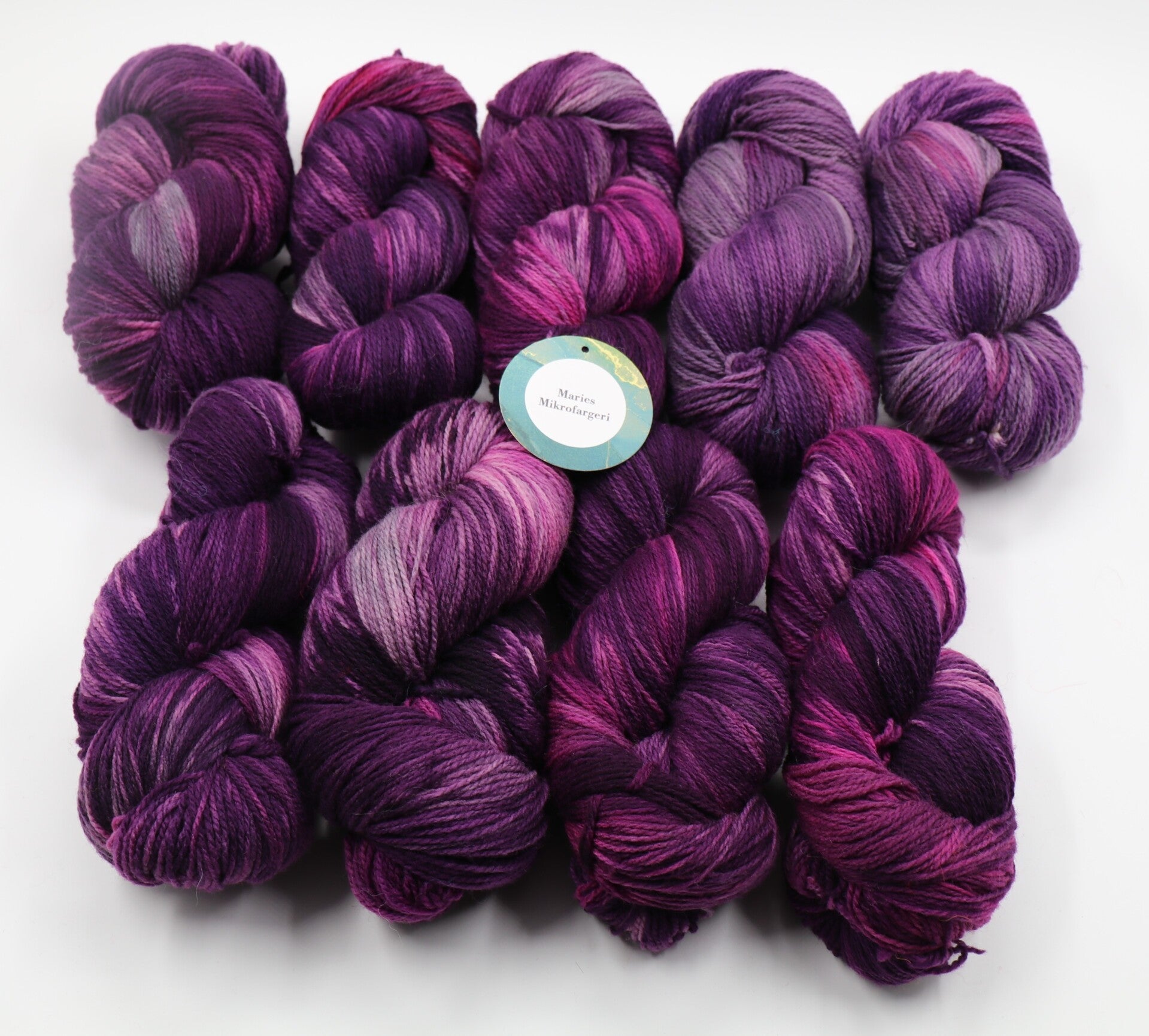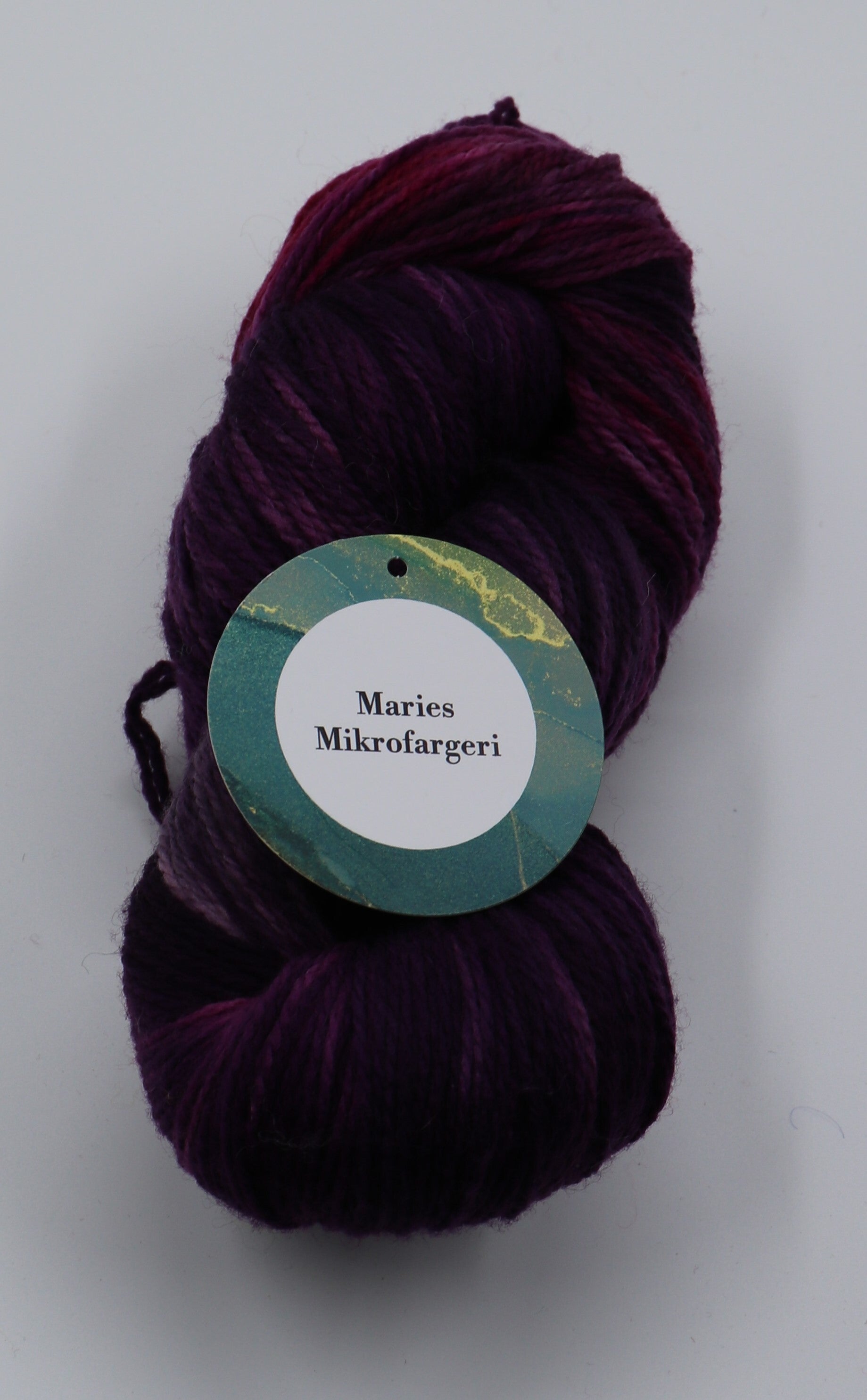 Herlig lilla , med toner i mørk og lysere lilla. Dette garnnet er inspirert av den enorme bjørnebærbusken vi har i hagen.